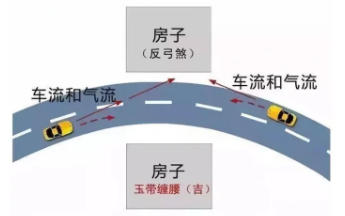 住房在弧形道路的弧形外側的就會被道路車輛或者河流河水帶來沖擊危險,這些房子就形成了反弓煞。