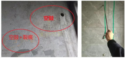 有的還可以直接通過肉眼來觀察,如果空鼓了,這個部位要比其他的稍微高一些,同時表面可能還會有裂縫。但是,如果用手按下去,發(fā)現(xiàn)里面其是空的。