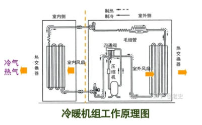 制熱循環(huán)是制冷循環(huán)的逆循環(huán),這時四通閥換向,制冷劑流向改變,即從壓縮機排出的蒸氣進入室內(nèi)的換熱器冷凝,冷凝后的制冷劑經(jīng)毛細(xì)管節(jié)后,在室外的換熱器中蒸發(fā),蒸發(fā)后再被壓縮機吸入壓縮,這樣周而復(fù)始地連續(xù)循環(huán),被加熱的空氣連續(xù)從風(fēng)管中送出。