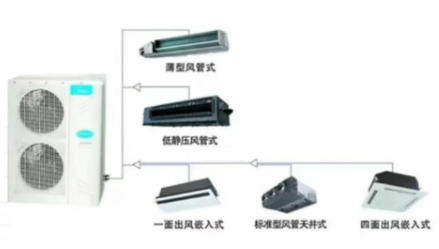 室內(nèi)的的熱交換器集中在一個室內(nèi)機上,室內(nèi)機產(chǎn)生的冷風(fēng)從系統(tǒng)風(fēng)管送達房間,再經(jīng)過回風(fēng)口